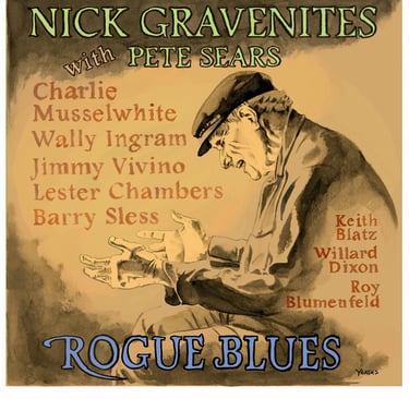 Recorded in 2022 and 2023, Rogue Blues features special guests Charlie Musselwhite, Jimmy Vivino, Barry Sless, Wally Ingram, and Lester Chambers of The Chambers Brothers. Pete Sears co-produced the record and is featured throughout. Renowned illustrator Thomas Yeates designed the cover and photo art and is also a co-producer. The record features 7 songs many never released.
